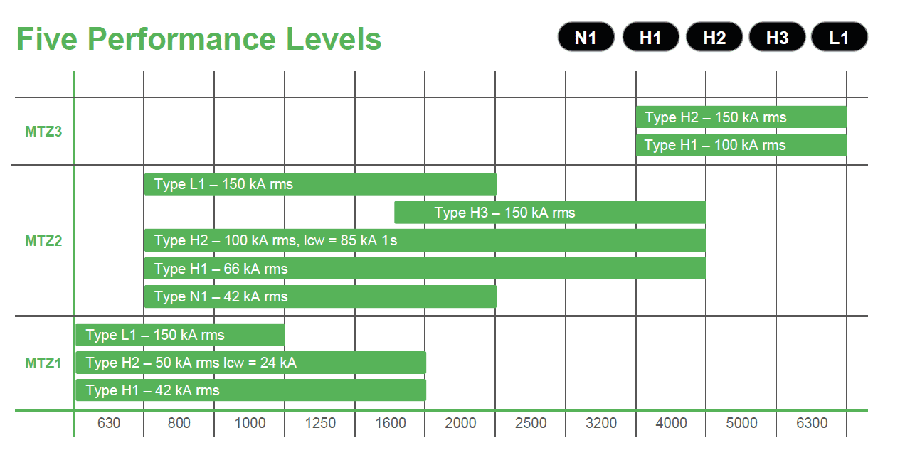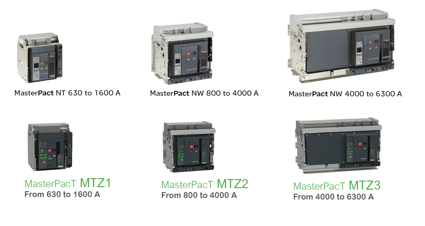 کلیدهای نسل جدید اشنایدر سری MTZ هم در ۳ سایز و در رنج ۶۳۰ تا ۶۳۰۰ آمپر با قدرت قطع های متفاوت در دسترس است.