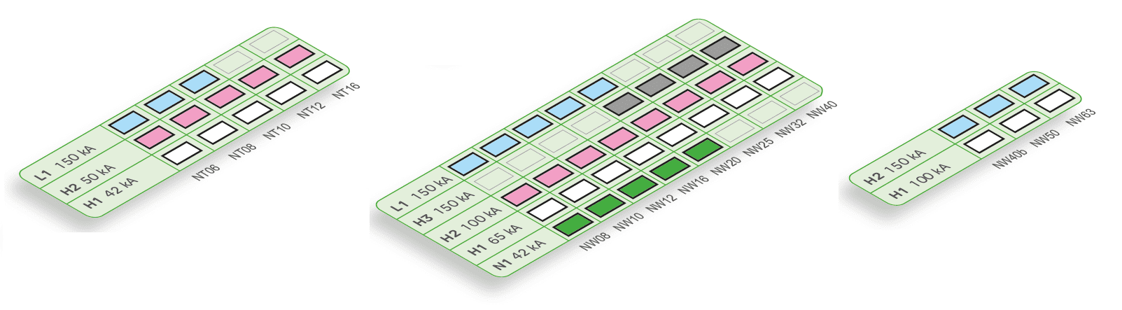 کلیدهای سری NT از رنج ۶۳۰ تا ۱۶۰۰ آمپر در قدرت های قطع مختلف و از لحاظ ابعاد در یک سایز تولید می شود.