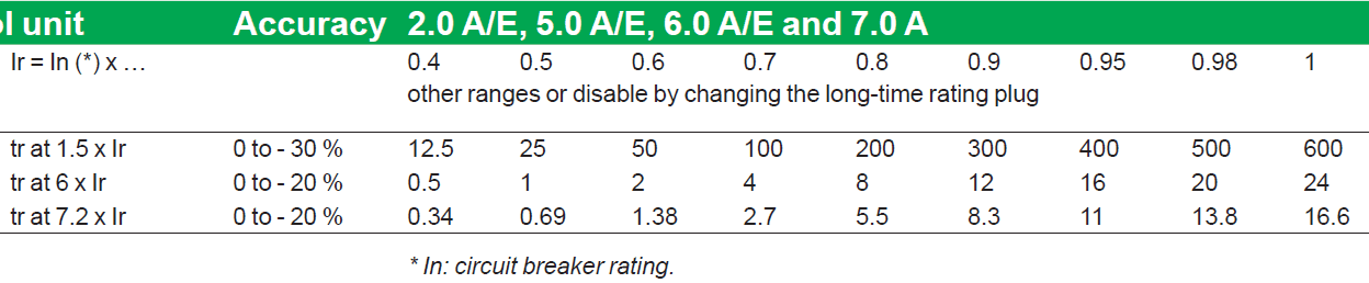 هرچند زمان Tr برای نقطه ای از منحنی قطع که ۶ برابر جریان Ir تعریف شده است ولی به همان نسبت کل منحنی قطع کلید جابجا خواهد شد. برای مثال همانگونه که از جدول زیر پیداست برای جریان های ۱.۵ برابر جریان Ir ،  زمان Tr اگر روی ۲۴ ثانیه تنظیم شده باشد، زمان تریپ ۶۰۰ ثانیه طول خواهد کشید.