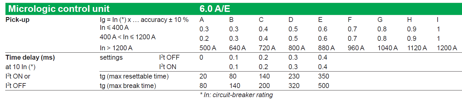 تنظیم جریان پیکاپ خطای اتصال به زمین (Ig) و زمان تاخیر در قطع (Tg) توسط میکرولاجیک سری ۶ قابل پیاده سازی است. چرخاننده مربوط به Ig بر خلاف دیگر چرخاننده ها با حروف درجه بندی شده است. در جدول زیر معانی مرتبط با هر حرف که برای جریان های نامی مختلف متفاوت است را مشاهده می فرمائید.