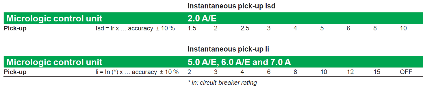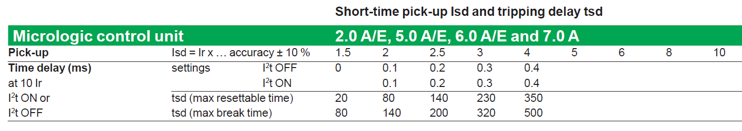برای جریان های بالاتر از ۱۰ برابر Ir، برای هر دو محدوده ۱ و ۲ بالا بسته به این که چرخاننده عددی tsd روی چه پله ای قرار گرفته ماکزیمم زمان قطع کلید  (max break time) و ماکزیمم زمان تحمل کلید درحالت خطا (max resettable time) یک مقدار ثابت بر حسب میلی ثانیه است که در جدول زیر مشاهده می کنید.