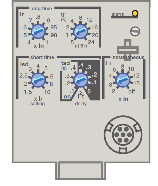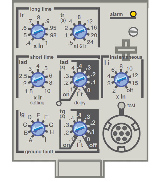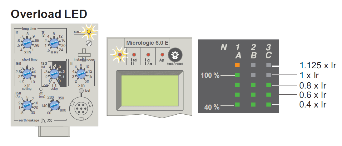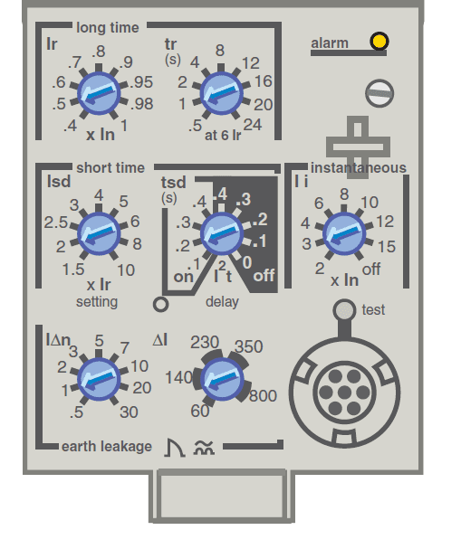 برای مثال اگر کلید شما ۱۶۰۰ آمپر بوده و Ig روی حرف H قرار گرفته، جریان پیکاپ شما برای خطای اتصال زمین ۱۱۲۰ آمپر خواهد بود. بنابراین اگر قصد تست کلید به روش تزریق جریان به یک پل را دارید، خطای اتصال به زمین زودتر از خطای اضافه بار بوقوع می پیوندد و سیگنال LED آلارم مربوط به Ig روشن خواهد شد.