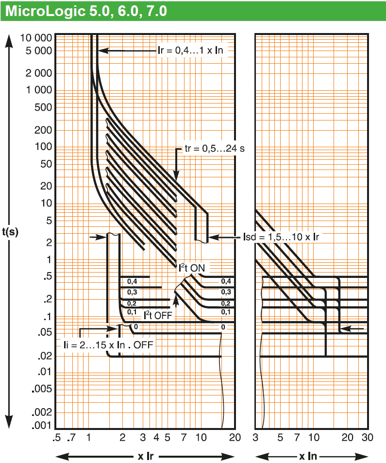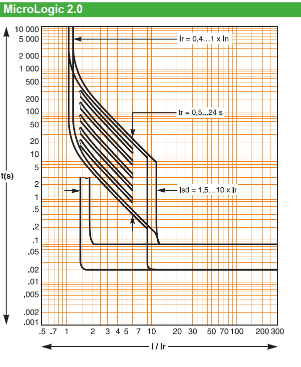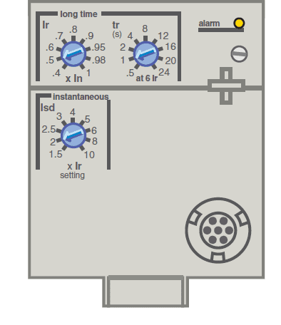 در حفاظت اضافه بار می توان جریان تنظمی (Ir)  را به صورت ضریبی از ۰.۴ تا یک برابر جریان نامی میکرولاجیک (In) تغییر داد. همچنین با تغییر در چرخاننده عددی زمان Tr ، می توان زمان قطع را وقتی جریان عبوری از کلید ۶ برابر جریان تنظیمی Ir است،  بین ۰.۵ تا ۲۴ ثانیه تنظیم نمود.